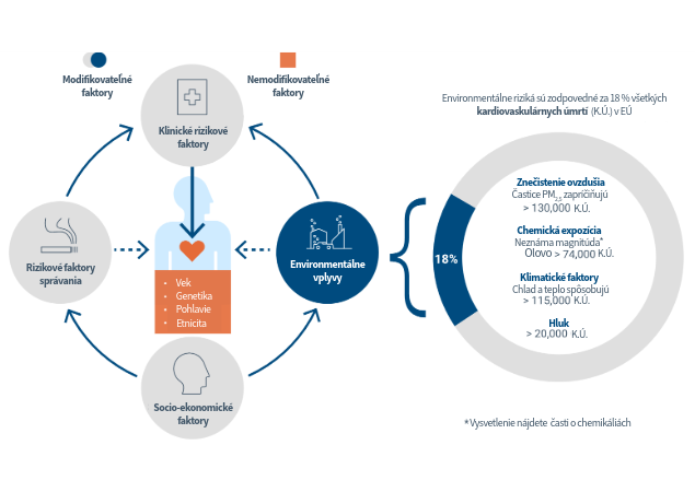o Medzi hlavné environmentálne rizikové faktory na kardiovaskulárne ochorenia patrí znečistenie ovzdušia, hluk, chemikálie a extrémne teploty.